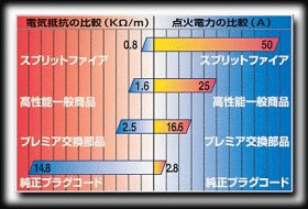 従来の殆どの高性能プラグコードは芯線の抵抗を下げる事によって電気エネルギーのロスを抑制し強い火花をスパークプラグヘ発生させ、完全燃焼を促進させています。