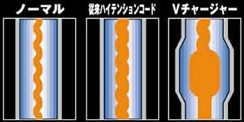 次世代プラグコード『Vチャージャー』は新しい発想と先進の技術によって開発された【メインコア】がプラグコードの中間部分に装着され、コイルからの二次電圧の流れを整流しなおし、かつ高エネルギー化し、各気筒への点火エネルギーを一定に保ちながらスパークプラグヘ供給します。