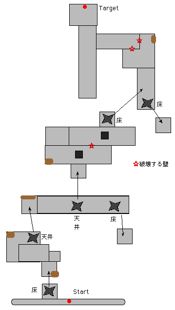 スタート地点から矢印に従って進むと最短でターゲットに到達する。途中にいろいろと関係ない部屋と敵がいるが相手にする必要はない。