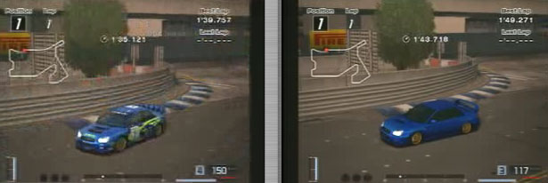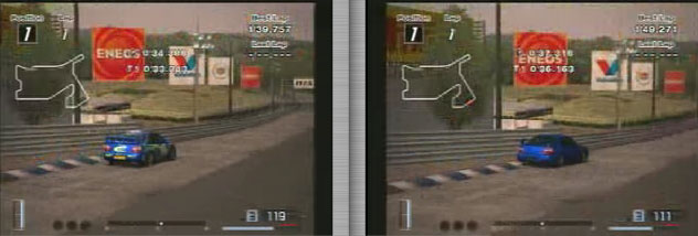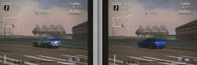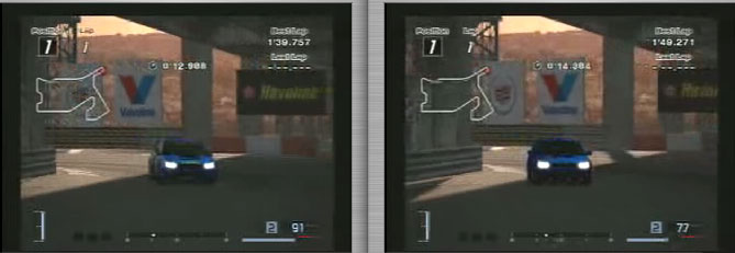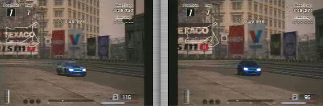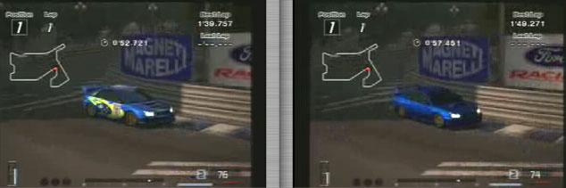 最初の右コーナーからの立ち上がり速度。ラリーカーが90キロ、ノーマルが77キロ、、20キロもちがいます。