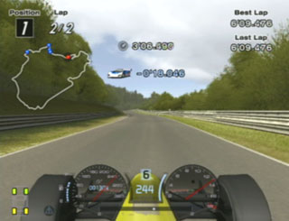 一周目、Arembergの右コーナーまでに一位になり、このまま楽勝と思ったのですが、Krostertelの直線の途中の小さなコーナーでスピン(大汗) 10秒ぐらい損しました。ニュルブルクリンクは道幅が狭いのでスピンしたら回復に時間がかかるのです。