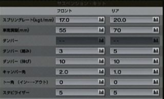 スプリングは一番固めです。コーナーの前半でアンダーを減らす為にフロントを少しやわらかくしました。