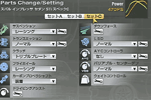 セットCのフルチューニングでは簡単に勝ててしまう、という場合に出してくるクルマです。ちょっと出力をおとして、高いポイントをねらうときに使います。工事中