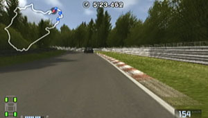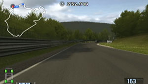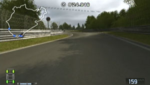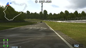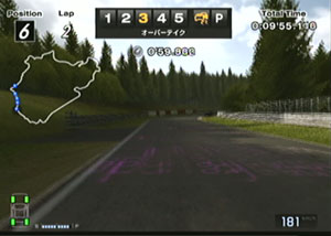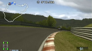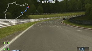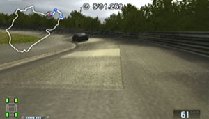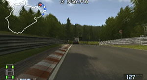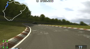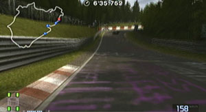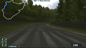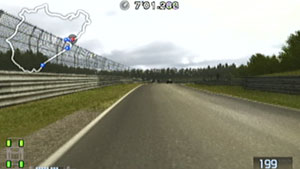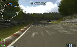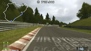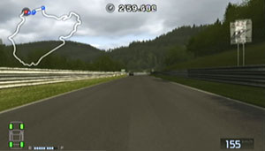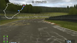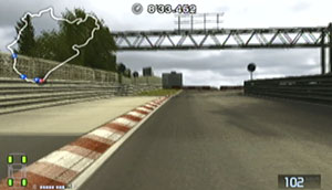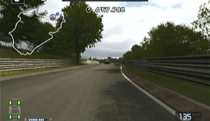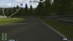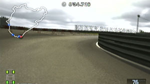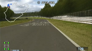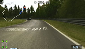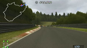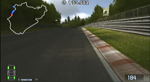 左の縁石が終わるあたり、この凸の形の木の陰のあたりでブレーキで130前後で右コーナーをクリア。