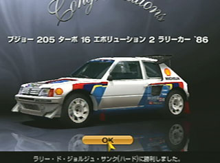 相手はプジョー205ターボ16Evo2ラリー。かなりの強敵です。 ・順コース スタートしたら80pointの表示が。そこそこむずかしそうです。一回目は壁に激突して5秒のペナ。これで置いていかれてしまったのでやりなおしました。一回5秒ペナくらうとちょっと追いつかないです。 何度目かで、スタート直後にcomとぶつかりいきなり5秒ペナくらいましたが、がまんしてついていったら、一周目の途中で抜くことができました。そのまま壁にぶつからいように注意しながら、がまんしてゴール。ベストラップ1分22秒。ムービーを公開しました。こちら。 ・リバース またコースを頭にいれないといけません。やれやれと思いながらスタートすると、ポイントが8pointとの表示なってます。はて。やけに少ないポイントではないですか。と思いつつ走ると今回はcomカーは遅いです。すぐ抜いて独走でゴールできました。 プレゼントカーはプジョー205ラリーカー86でした。