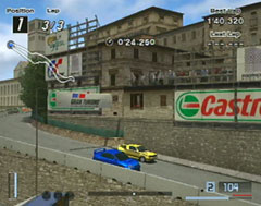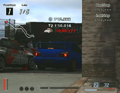 ライバルは三菱ランサーエボ・ラリーカー、年式不明。こちらはインプレッサWRXのノーマルに軽量化3,ポート研磨、エンジンバランスを施した仕様で出場。おまけにソフトタイヤ履かせてますが、さすがにラリーカー相手に荷が重いかなと思いつつスタートすると40pointと出ました。意外と点が低い、ということは、勝てそうかも。スタート直後の登り坂では、あまり離されなかったのでますますイケルと。こちらはノーマルの足ですので高速からのコーナーではロールが大きくて反応が遅いので慎重に走りました。
