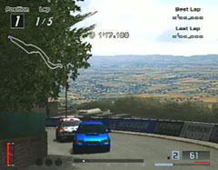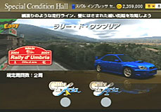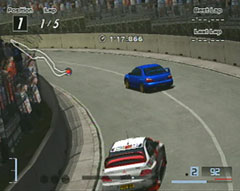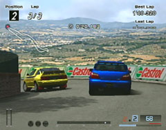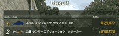 ライバルは三菱ランサーエボリューションVIII MR GSR。こちらはインプレッサWRXのノーマルに軽量化3,ポート研磨、エンジンバランスを施しただけで出場。スタートすると6pointの表示がでました。かなりこちらの戦闘力が高いようです。登りのストレートのあとの下り坂。右ヘアピンでインからパスしました。そのまま3周。ゴール直前で壁にヒットして5秒のペナルティくらいましたが、10秒差で余裕のゴールでした。