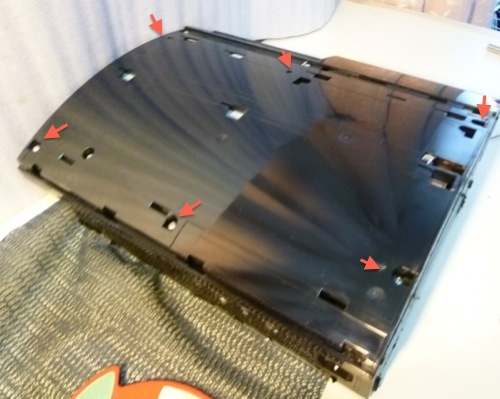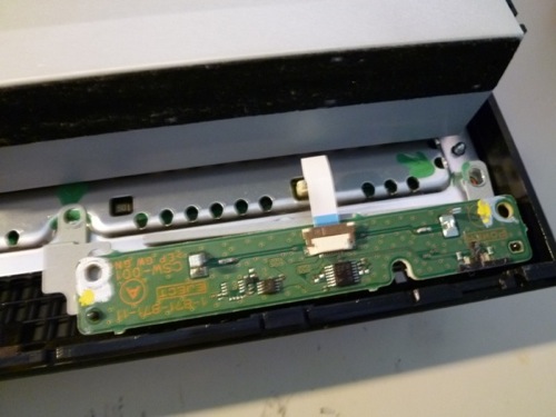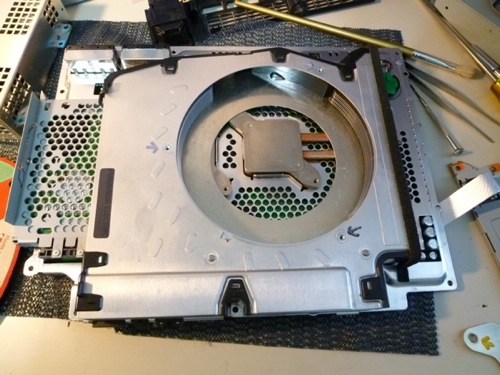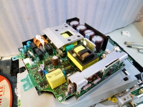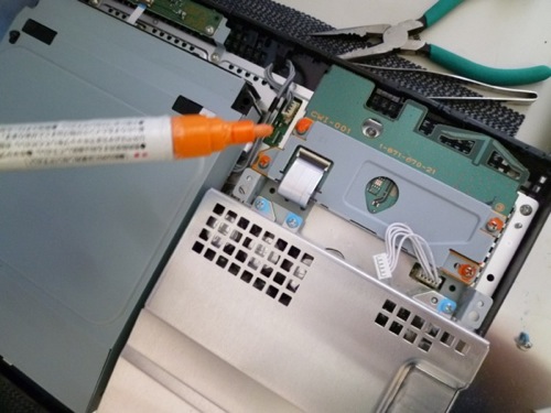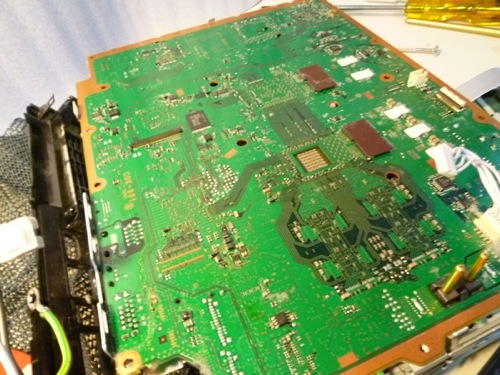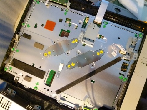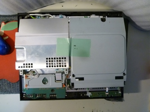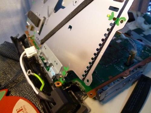 左がブルーレイのドライブ、右が電源です。 ブルーレイのドライブは固定されてないので注意!!! 外れるとコネクタに負荷がかかります。 慎重に。 これからさらにネジが増えるのでマーカーでネジと周辺に色をつけておきます。あとで組み付けるときにネジの場所が一目瞭然です。 それにしても、このプレステはネジがものすごく多かったので、マーカーも何色か必要でした。