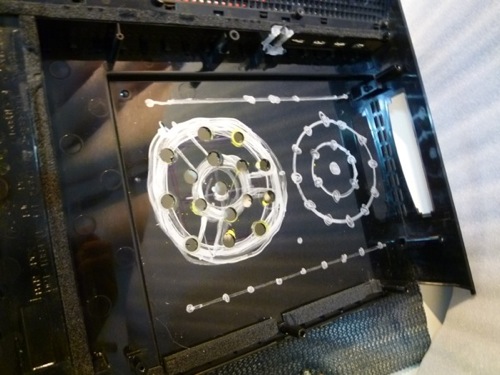 いよいよ、ケースに風穴を開けます。 シルバーのマーカーで印を入れてドリルでドリドリ。