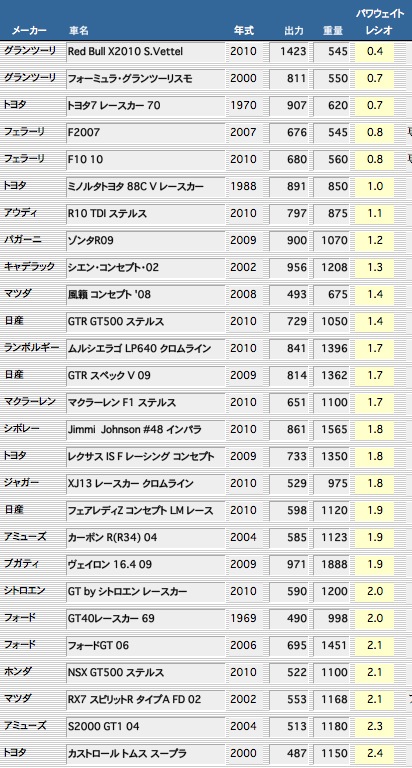 クルマの重量を出力で割り算したものがパワーウェイトレシオです。これが小さいほど加速がよくなります。