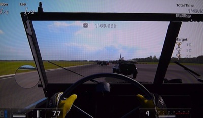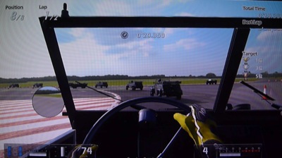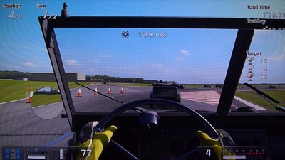 スタート直後の左コーナー。ここでは必ず直前の一台がcomカーの襲撃にあってコースアウトする。それがコースにもどってきてこちらの背後からリヤに当たって失格ということもある。 |