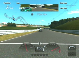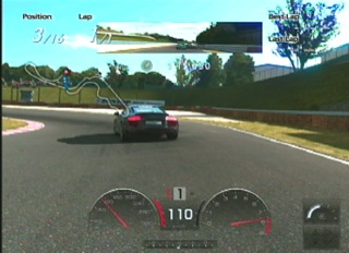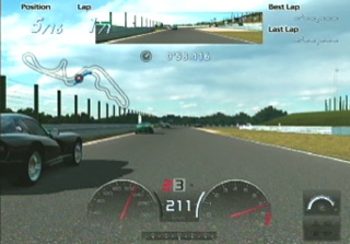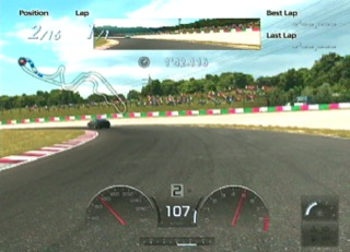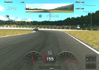 ここで一台パスしますが、つぎの右コーナーへの進入がインからとなり、きびしくなるので早めにブレーキでスピードを落としてクリアします。 |