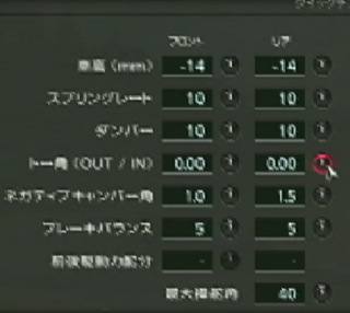 グリップが少ないと思ったらバネを固くして、ふわふわしてると思ったらダンパーを固くして、、をしている間にバネ、ダンパーともに最高値になってました。