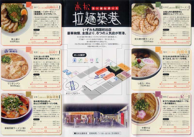 | 高松ラーメンポートってのが、サンポート高松にオープンしました。まぎらわしい名前ですが、サンポート高松ってのが、40階ぐらいのとてつもなく高いビルです。場所は、高松駅のとなり、全日空ホテルのよこです。 |