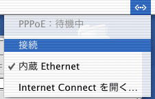 ADSLに接続するには、メニューバーの右上の<-->の項目の「接続」を選ぶ。これでインターネットに接続される。