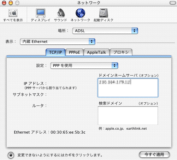 意外とこれが簡単だった。 まず 「場所」のところは適当な名前をつける。この例では「ADSL」とした。 以下のようにTCP/IPを「PPPを使用」にする。 「ドメインルームサーバー」はプロバイダから指定されたものを入力する。