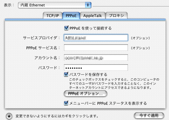 つぎにPPPoEに切り替えて以下のように、サービスプロバイダとアカウント、パスワードなどを入力する。 PPPoEサービス名は空白でよい。 最後に「今すぐ適用」ボタンを押す。