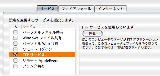まずシステム環境設定から「共有」→「サービス」で下のように「ftpサービス」を開始します。