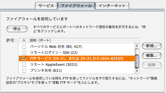 またファイアーウォールはftp以外は通さないようにしておきましょう。システム環境設定から確認できます。