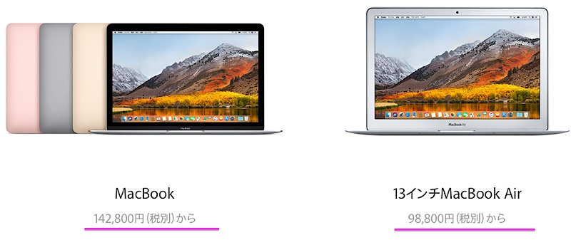 MacBookは12インチディスプレイで14万2800円から、MacBook Airは13インチで98800円から。