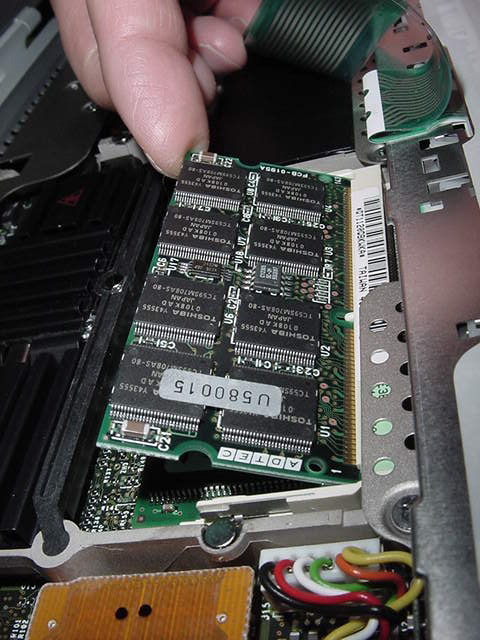 増設するメモリーをまず、ななめにセット。しっかり奥まで差し込むこと。 |
