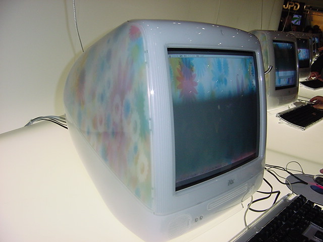 ことしのEXPOの目玉は、なんといっても花柄imacでしょう。いつかは出るかもしれないと思いつつ、ほんとに花柄、出しましたか、ってかんじですね。しっかりアップルのブースでポスターもらってきました。