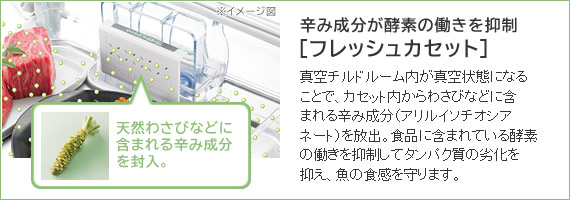 真空チルドルーム内が真空状態になることで、カセット内からわさびなどに含まれる辛み成分(アリルイソチオシアネート)を放出。