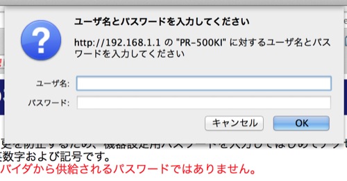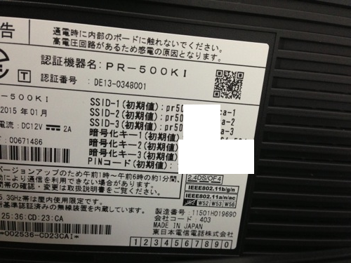 SSIDとパスワードを指定するのですが、それは、PR500KIの背面に貼られてあります。