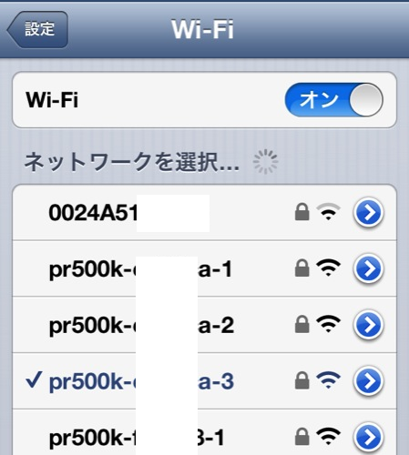 iPhoneの設定からWi-Fiを押すとPR500KIの背面に貼られてあるネットワークが出現しています。