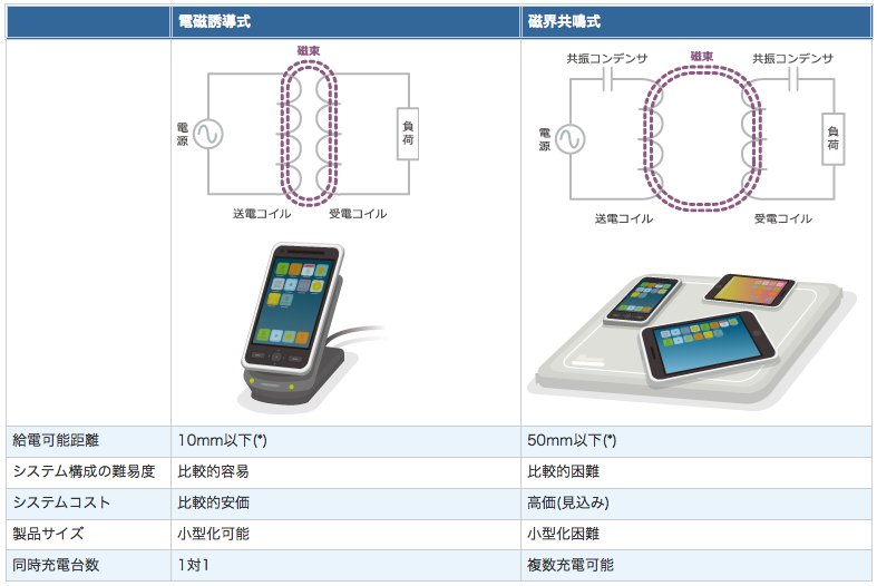 一方、磁界共鳴式のワイヤレス給電は、送電側と受電側にコンデンサを挿入してLC共振回路を形成し、送電側と受電側の共振周波数を一致させて電力伝送する 方式で、コイルの対向距離を大きくとることができ、また、コイルどうしの中心が多少位置ずれしても電力伝送できるのがメリットです。このため、複数台のモ バイル機器を同時充電する充電パッドなども可能にします。