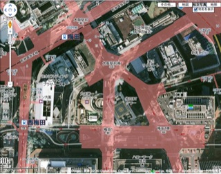 まずは大阪梅田のマルビル付近、、こちらgoogleですが、主要な地点の地名が表示されているので便利です。