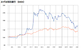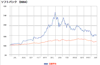 ここも出来高が高く、人気の高い銘柄です。一見すると日経平均と連動してないようにみえるのですが、細かく見ると、日経平均の波形を増幅したようにも見えます。上がるのも下がるのも大きくジェットコースターみたいで新興銘柄みたいなものですねえ。これがおもしろくて人気があるのかも。ソフトバンクと同様におもしろい株です。