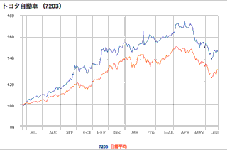電装機器の王者、デンソーです。しっかり日経平均と連動しているので、あまり心配のない銘柄です。きれいな波形ですねえ。日経平均よりも上に位置してますので上昇するときは幅が大きそうです。
