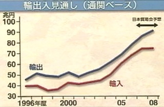 08年の輸出は90兆円を超える予想。輸入が75兆円程度。
