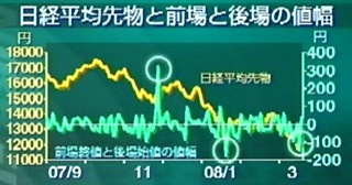 日経平均先物の前場と後場のギャップの幅が大きく10円以上離れたときは自律反発のサイン。 |