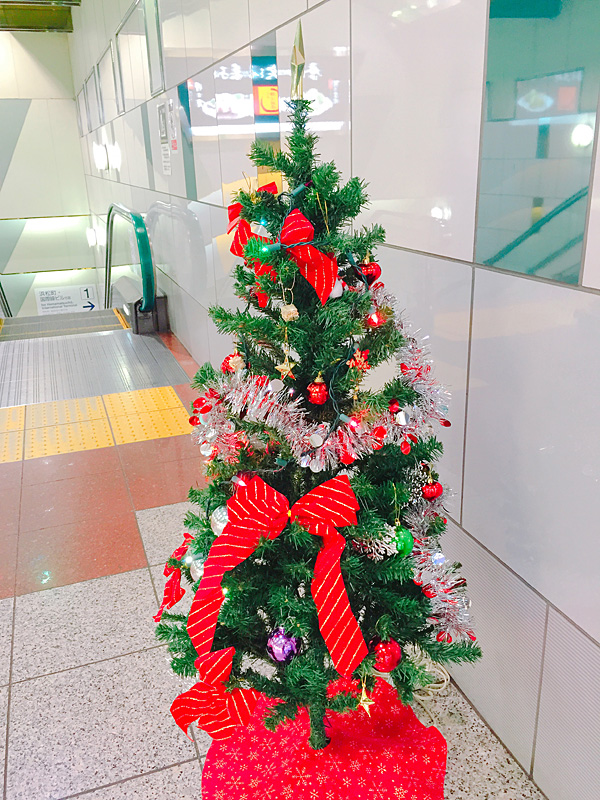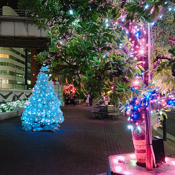コンクリートの合間に夜はクリスマスツリーの明かりが灯る。