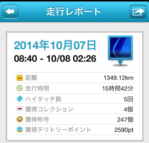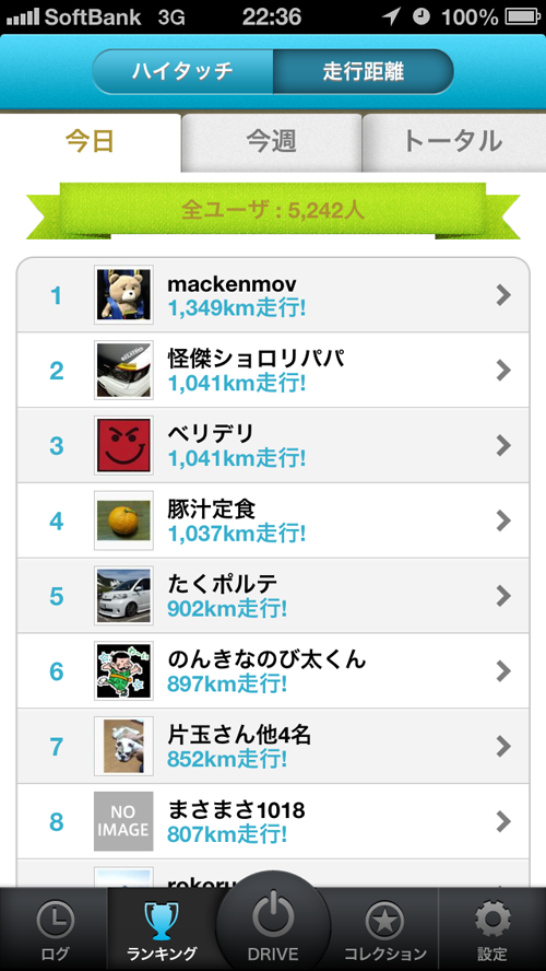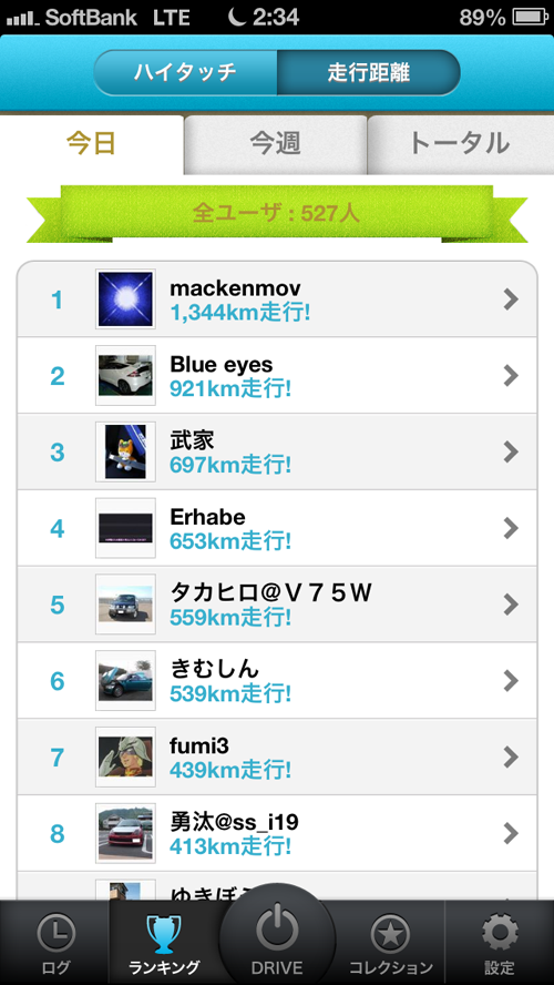 深夜の2時すぎに走行を終えて、すぐにランキング表示したら、その日が始まったばかりだったのでユーザー数は527人と表示されてしまいました。