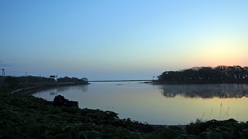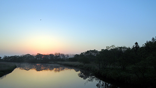おだやかな水面にうっすらと日の出の朱色と夜明けの空色が絶妙でした。