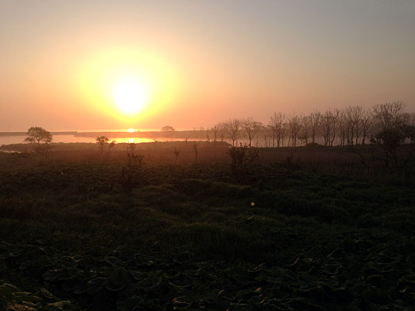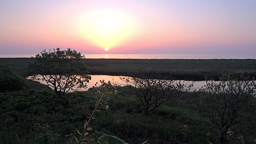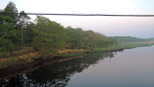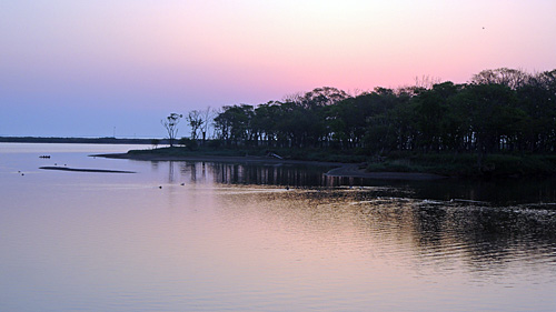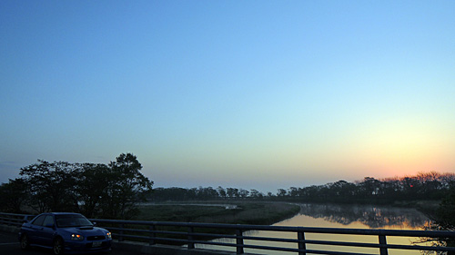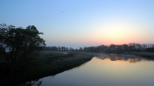おだやかな水面にうっすらと日の出の朱色と夜明けの空色が絶妙でした。